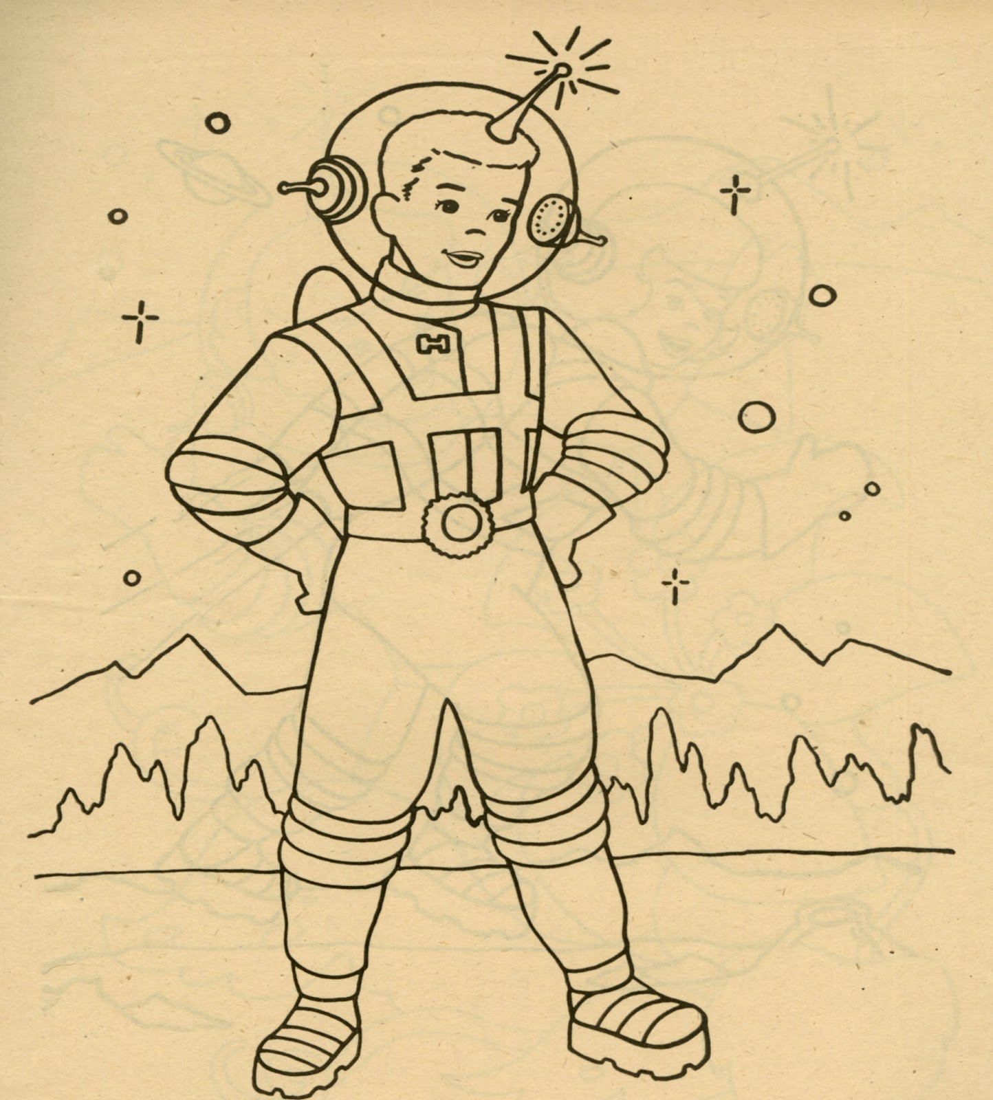 This illustration is just wrong. Why do the children get (or need) space suits while the poor dog has to suck vacuum? There is also the small problem in how that ship behind them is going to take off. Maybe it was a one way trip.