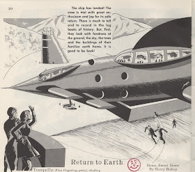 Here is a weird treat. This is some 1953 sheet music that was created (perhaps) to cash in on the space craze and to entice young piano students to practice. The text and illustrations are exactly what helped young pianists want to go into space!
