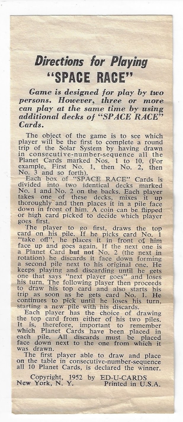 The Space Race card game was created by the Ed-U-Cards Co, NY. It is a little too early for me to have played it but it is one of the first popular uses of the term "Space Race" and may have influenced space-happy children to think about who would get to space first. Rather than explain the rules, here is the sheet below. Basically first person to get all the destination cards 1-10 wins (but there are set-backs along the way).