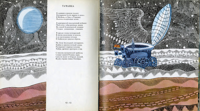 This is a little out of my scope for children's books but I enjoy the interesting illustrations. It seems to be commemorating the25th anniversary of the soviet space program (which began Oct 4, 1957). It looks like poetry and illustrations inspired by the history of space exploration in Russia.